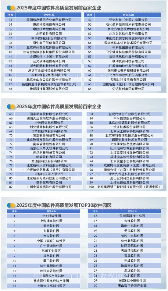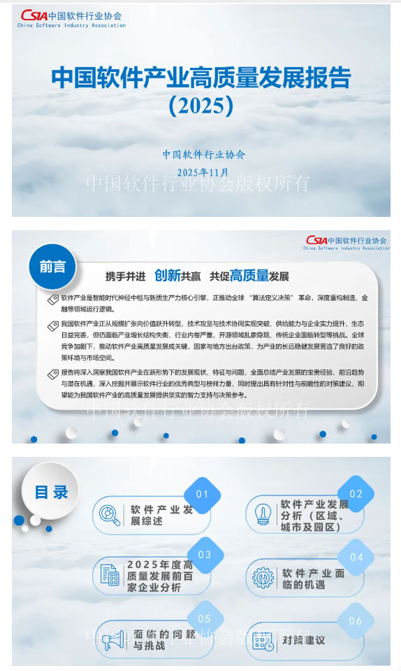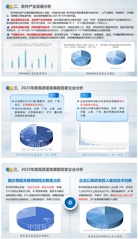 《报告》依据《软件企业高质量发展评估标准》(T/SIA 044—2025)和《软件园区高质量发展评估标准》(T/SIA 062—2025),结合调研数据、公开资料等,形成“2025年度中国软件高质量发展前百家企业”和“2025年度中国软件高质量发展TOP30软件园区”,不仅为行业树立了企业与园区发展的标杆典范,更通过清晰的评估维度与量化指标,为广大软件企业与园区指明了提升方向,助力推动产业资源向优质主体集聚,加速构建自主可控、协同共生的软件产业高质量发展生态。