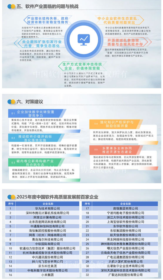 近日,《中国软件产业高质量发展报告(2025)》(以下简称“报告”)在2025中国软件高质量发展大会上正式发布。继去年首次发布后,报告再续新篇,系统呈现了软件产业的新动态,以助力行业高质量发展。大会也公布了报告收录的“2025年度中国软件高质量发展前百家企业”和首次发布的“2025年度中国软件高质量发展TOP30软件园区”。