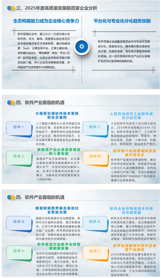 《报告》系统梳理了新形势下我国软件产业面临的八大历史性机遇,具体包括大模型引领技术革新与生态重构、人机共治时代工业软件成为行业引擎、数据资产化从资源管理进阶入表实践、软件客户向消费端转变重塑开发范式、数据联接跨界融合驱动社会智能治理、软件企业并购促技术升级与市场拓展、软件驱动行业数字化转型赋能新发展、软件出海服务外包并进重塑产业格局。这些机遇为产业高质量发展提供关键突破口。