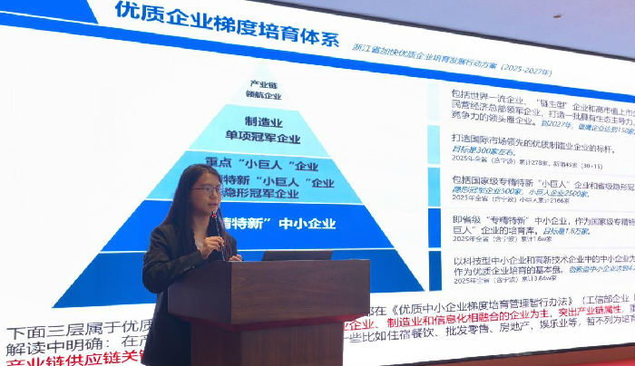 政策导航:浙江省工信院企业发展研究所王琼萱老师详细解读了专精特新梯度培育的逻辑与申报路径,围绕不同培育阶段的企业专精特新申报要求,对评价标准等内容进行了细致解读,帮助企业明确成长方向。